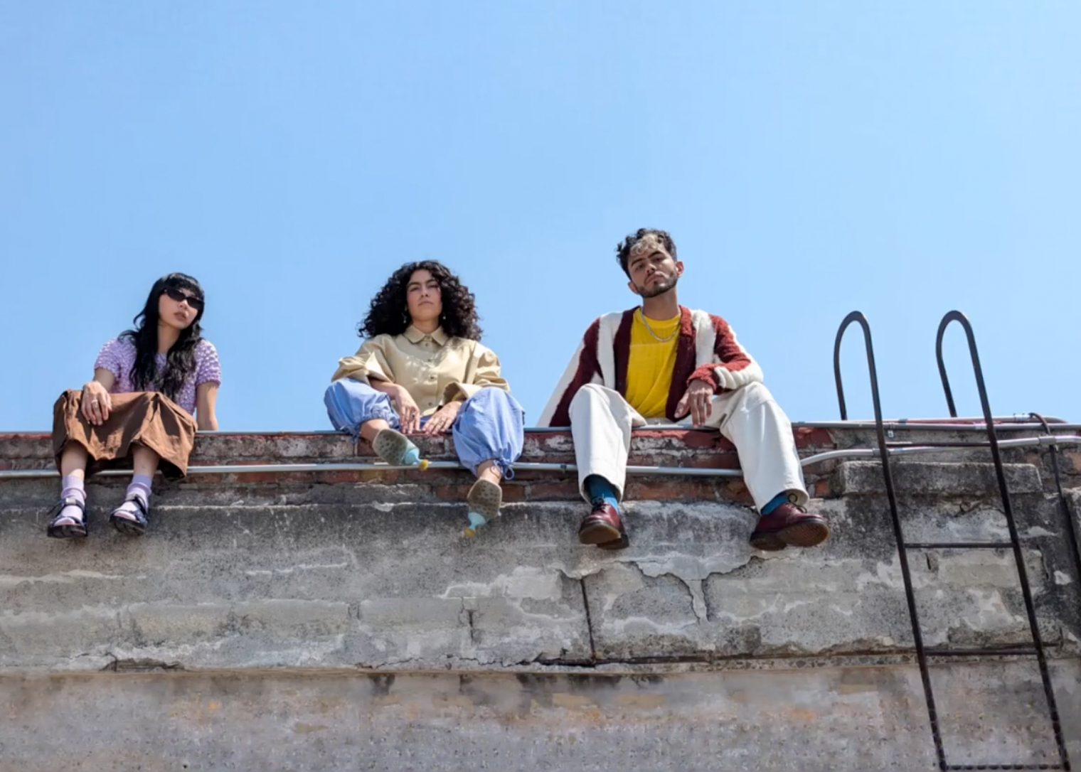 Two people pose seated against a wall in dim light.