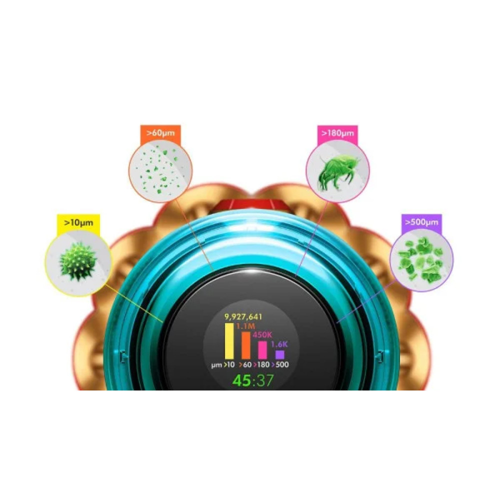 За стабильное всасывание отвечает двигатель Dyson Hyperdymium, разгоняющийся до 125 000 об/мин. Для вас это означает, что пылесос все равно уверенно забирает и пыль с паркета, и мусор из ковра, а не «притворствует уборку», когда ковер немного плотнее.150 АВт мощности всасывания достаточно для стандартной городской квартиры с ковровыми дорожками, детскими ковриками и шерстью животных. При этом электроника распределяет заряд так, чтобы тяга не проседала уже через 10 минут, а оставалась рабочей до конца уборки.